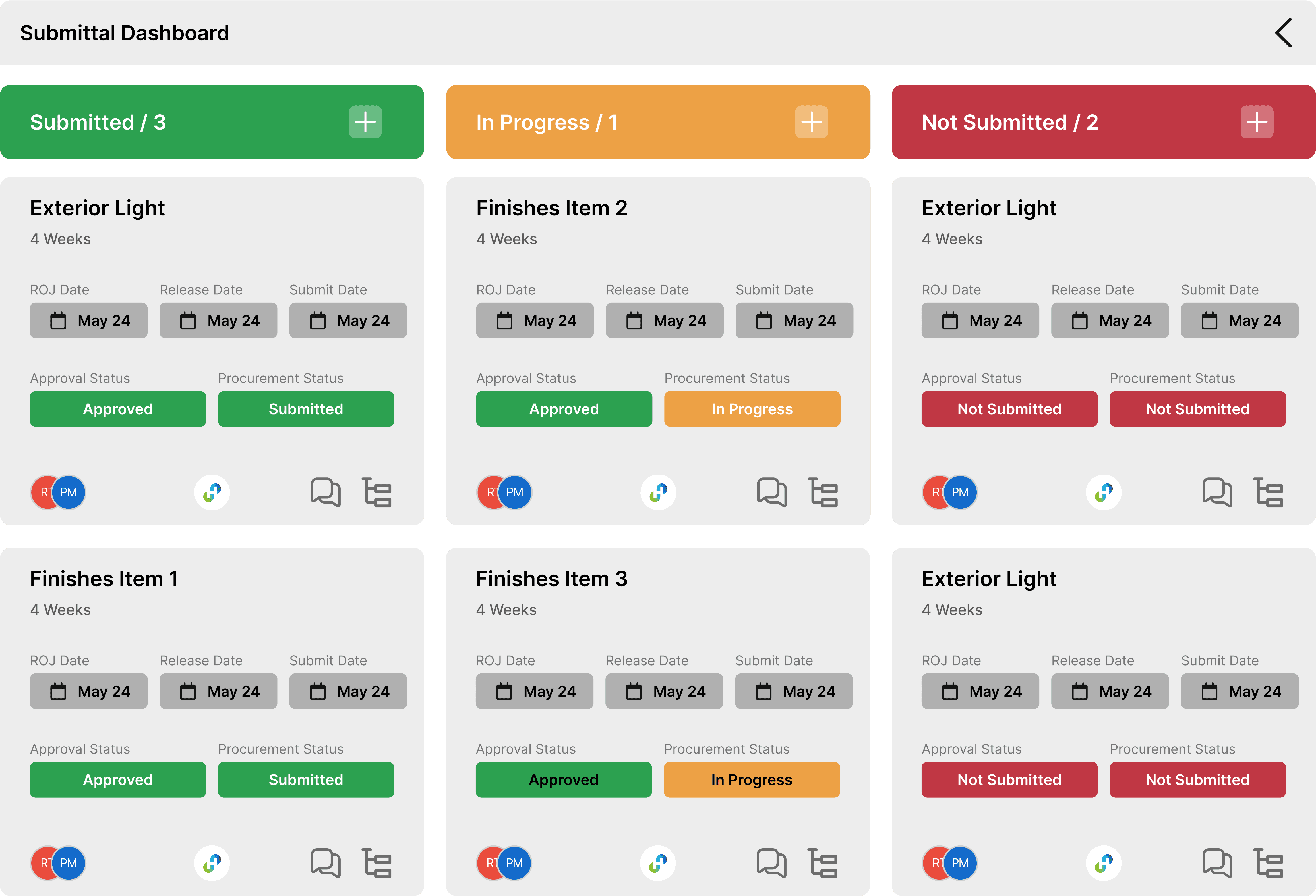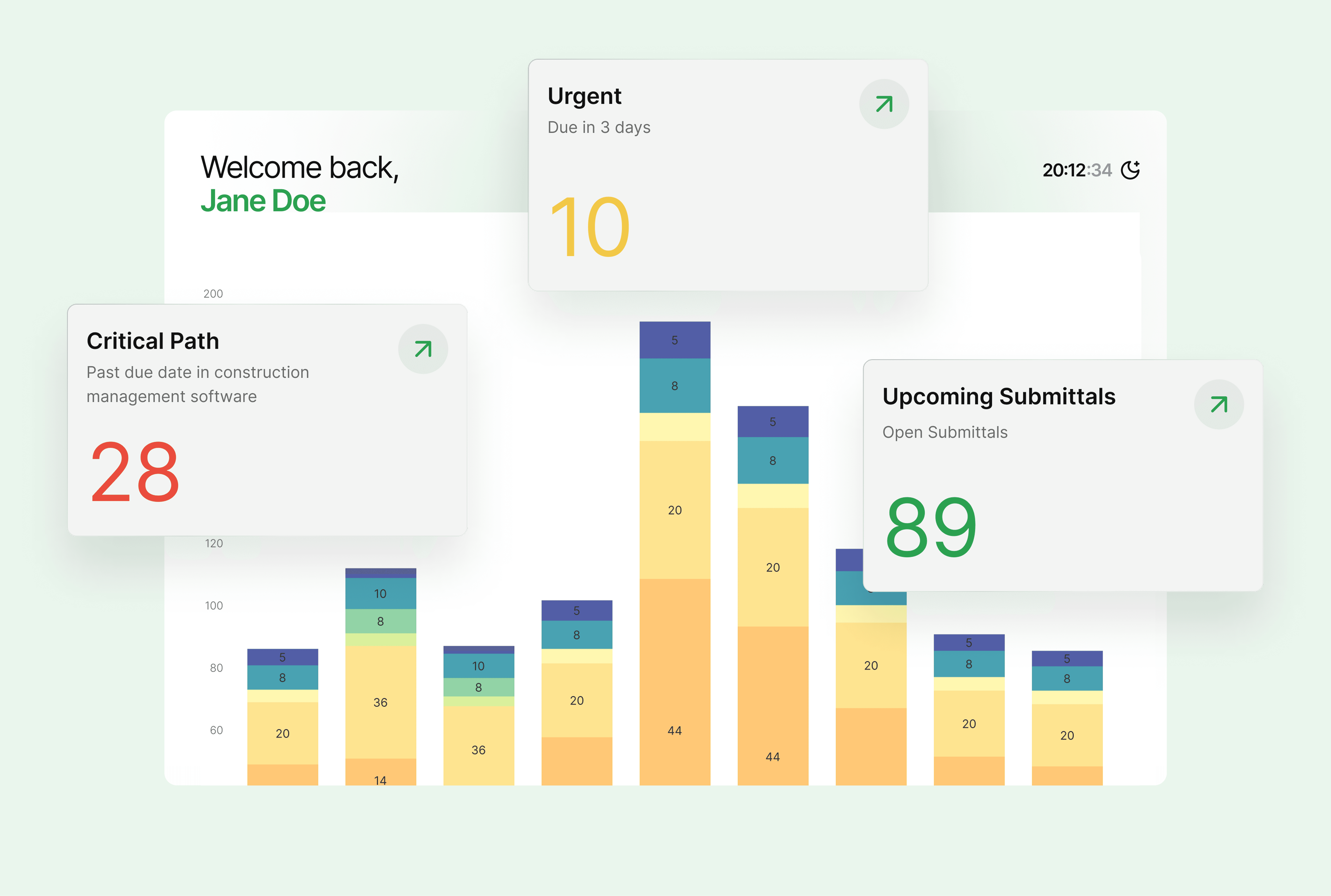 A real-time Submittal Dashboard shows what's late, what's urgent, and what's coming up—so nothing slips.