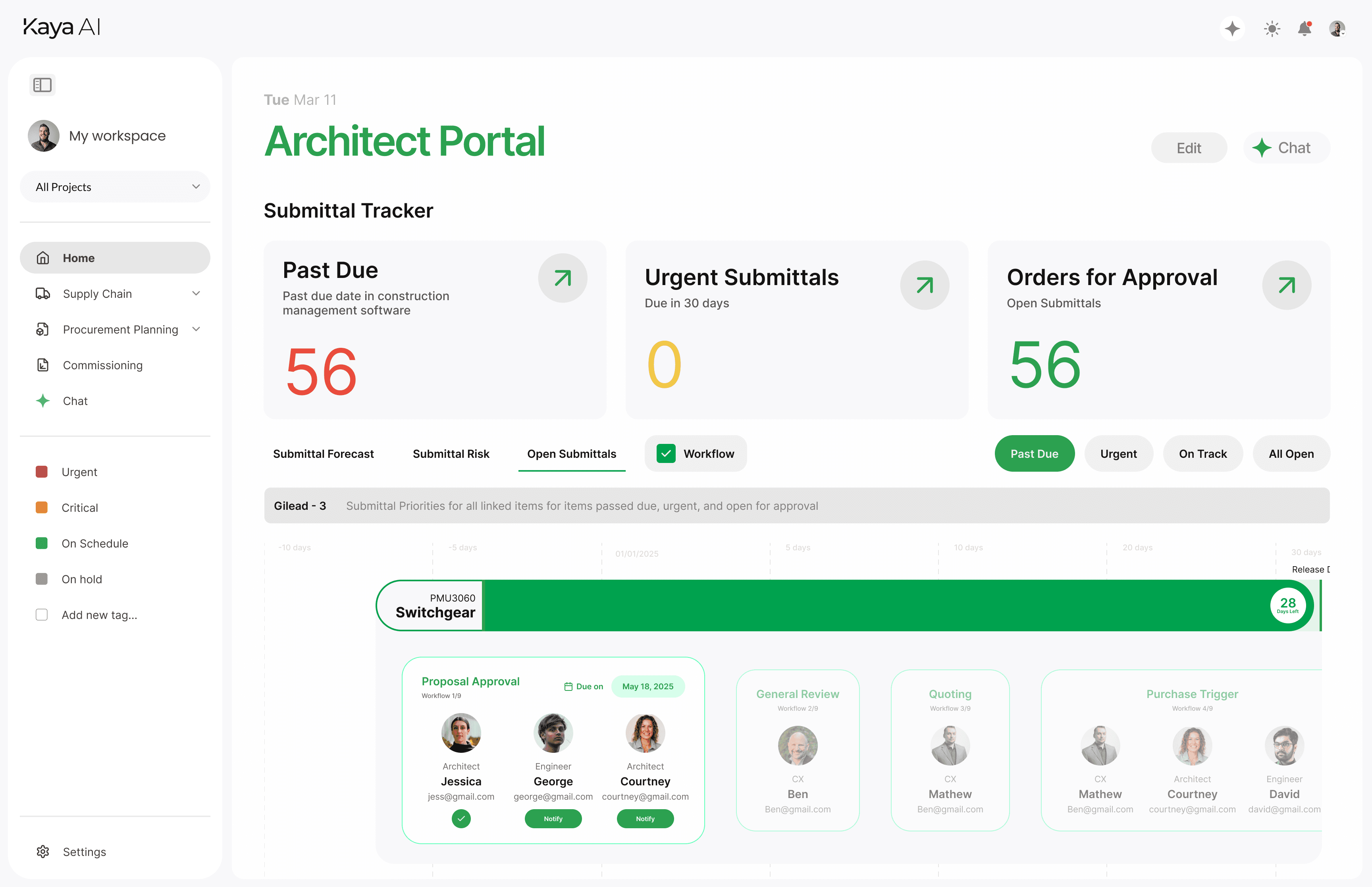 Approval portals for architects and engineers with submittals tied to scope, dates, and changes.